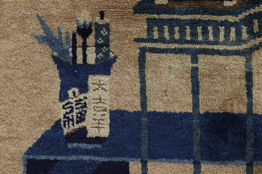 Tappeti Khotan: Si tessono a la vecchia città Khotan (Hotan) in sud Uygur, regione autonoma di Xinjiang (Cinese Turkestan). Combinano dettagli dalla Cina con moderni disegni dall’ Asia Centrale e colori vivi da Ovest. I tappeti Khotan hanno un mucchio di lana con un ordito di cotone e di solito si fabbricano con nudo asimmetrico. I colori principali sono il blu, giallo o bianco e di solito rosso.