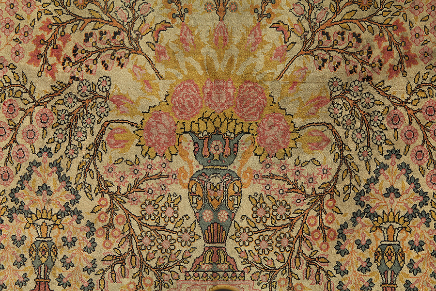 Tappeti Kirman: La tessitura di tappeti,antica tradizione a Kirman, costituisce uno dei settori manufatturieri principali della città .I tappeti qui prodotti sono famosi in tutto il mondo.Il tappeto più antico rinvenuto a Kirman risale a 500 anni fa.In oltre si fabbricano secondo la tradizione anche altri prodotti tessili di cotone o di lana, come scialli e tessuti sottili.Quando nel 1271 Marco Polo fece visita alla città ,Kirman divenne un centro commerciale che collegava il Golfo Persico conl' Asia Centrale.Durante la dinastia dei Savafidi,suoi tappeti furono esportati in Inghilterra e in Germania.Caratteristici sono i colori vividi e la quantità di fiori stupendi,con ghirlande e medaglioni.Le lane nella zona di Kirman sono di buonissima qualità,con un grado di grassezza che gli dona lucentezza.
