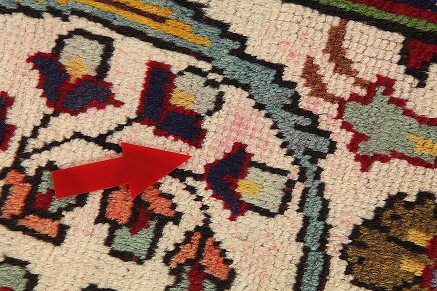 Abrash: Causa la differente grassezza delle lane e la differente quantità di sale ,nel corso del processo di tintura ,le lane assorbono quantitativi diversi di colore.Questo non è tanto visibile prima della tintura .Nel corso della tessitura però risultano variazioni cromatiche. Questo si chiama Abrash ed è la prova della genuinità e dell' autenticità di questi tappeti ,per i quali non vengono usate sostanze chimiche. Esempi