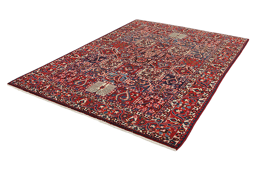 Tappeti Bakhtiari: Sui monti Zagros,a occidente della città Isfahan,intorno alla città Shar-e-Kurd, vivono i nomadi Bakhtiar.I loro tappeti sono noti per il disegno con vari quadrati ripetuti, in cui vengono rappresentati fiori o animali.Per questa ragione il disegno si chiama " Giardino"(Khesti).I loro tappeti sono assai robusti,dalla tessitura fitta e sono di una lana di qualità molto buona,ricavata da pecore che pascolano ad alta quota.I migliori tappeti Bakhtiari che hanno la maggiore fittezza di nodi si chiamano Bibibaf.In oltre in molti disegni si notano influenze dei manufatti Isfahan(Boldaji,Feridan,Saman).