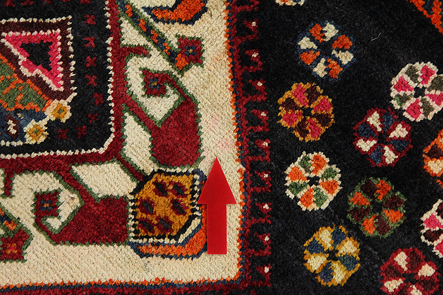 Abrash: Causa la differente grassezza delle lane e la differente quantità di sale ,nel corso del processo di tintura ,le lane assorbono quantitativi diversi di colore.Questo non è tanto visibile prima della tintura .Nel corso della tessitura però risultano variazioni cromatiche. Questo si chiama Abrash ed è la prova della genuinità e dell' autenticità di questi tappeti ,per i quali non vengono usate sostanze chimiche. Esempi