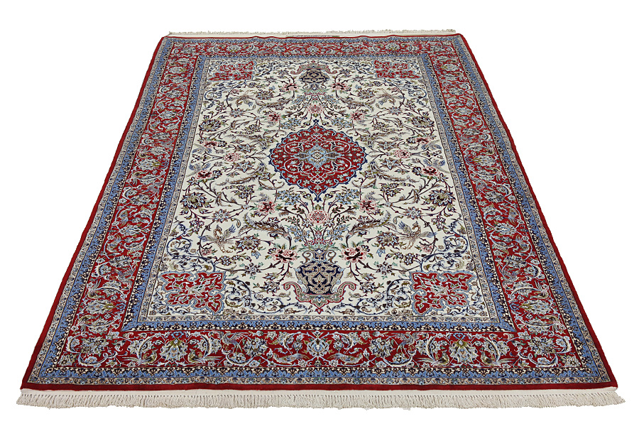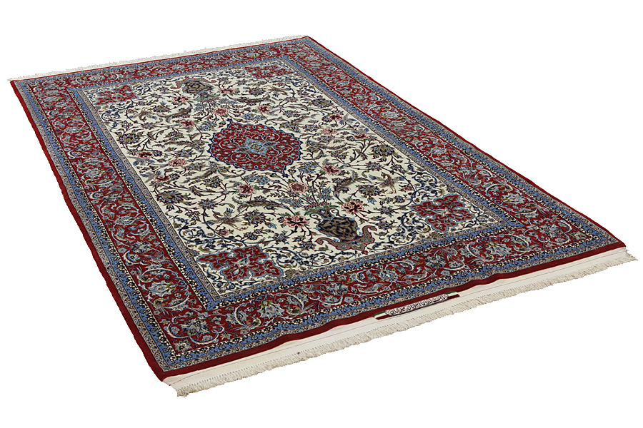 Tappeti Isfahan: Al centro dell' Iran tra i monti Zagros e il deserto,si trova la città di Isfahan.Oggi costituisce un significativo centro industriale con 1,2 milioni di abitanti.La cittadina è un gioiello architettonico.I vecchi Isfahan a differenza dei recenti,non avevano un medaglione centrale.Tutta la superficie del manufatto era ricoperta di elaborati fiori elicoidali e di fiori anthemia(palmette).I più recenti tappeti Isfahan non possono reggere il confronto con quelli antichi,che erano fabbricati esclusivamente per aristocratici.Continuando tuttavia la tradizione, anche gli odierni tappeti di Isfahan sono intessuti sottili e hanno il pelo corto,per far risaltare il loro disegno.Nella tessitura viene utilizzata anche la seta,per far risaltarealcune parti del disegno,soprattutto i fiori.Hanno l' ordito di seta o cotone.