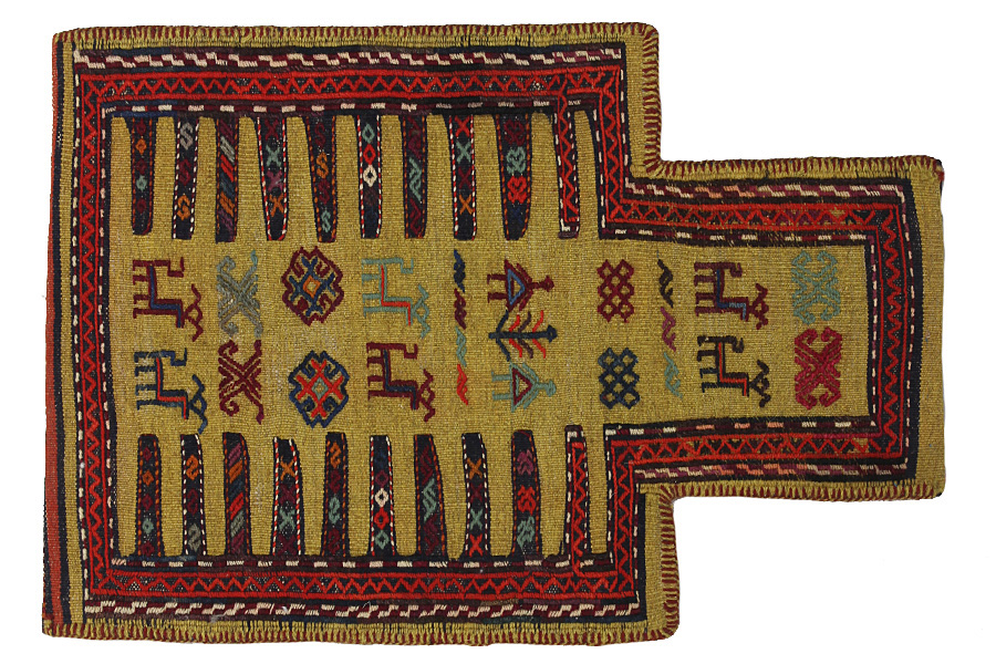 Tappeti Saddle Bag: Borse da sella cavallo sono fatte da nomadi per uso proprio. Si possono distinguere tra i kilim-cavallo borse da sella e le borse da sella cavallo. La parte anteriore di questo sacchetto e annodato come sella da cavallo o è annodato comeun tappeto comune con nodi ma capita anche che vengono utilizzate diverse tecniche di annodamento miste. Le parti laterali sono spesso tessuti mentre nella parte centrale sono applicate speso diverse tecniche di tessitura come i kelim o i Soumak. I colori delle Saltbags sono tutti naturali e creati da gli stessi i Nomadi. Borse come queste di solito vengono usate tutti i giorni per i viaggiatori su asini o cavalli. Un opera d'arte che offre un'atmosfera unica e orientale a casa vostra. Questi sacchetti possono essere utilizzati come cuscini, o per esempio sul pavimento come un cuscino davanti al camino,o come decorazione per il muro. Queste piccole borse da sella cavallo possono anche essere utilizzate come una "tasca" per giornali e altri oggetti quando e appeso suuna sedia o un divano.