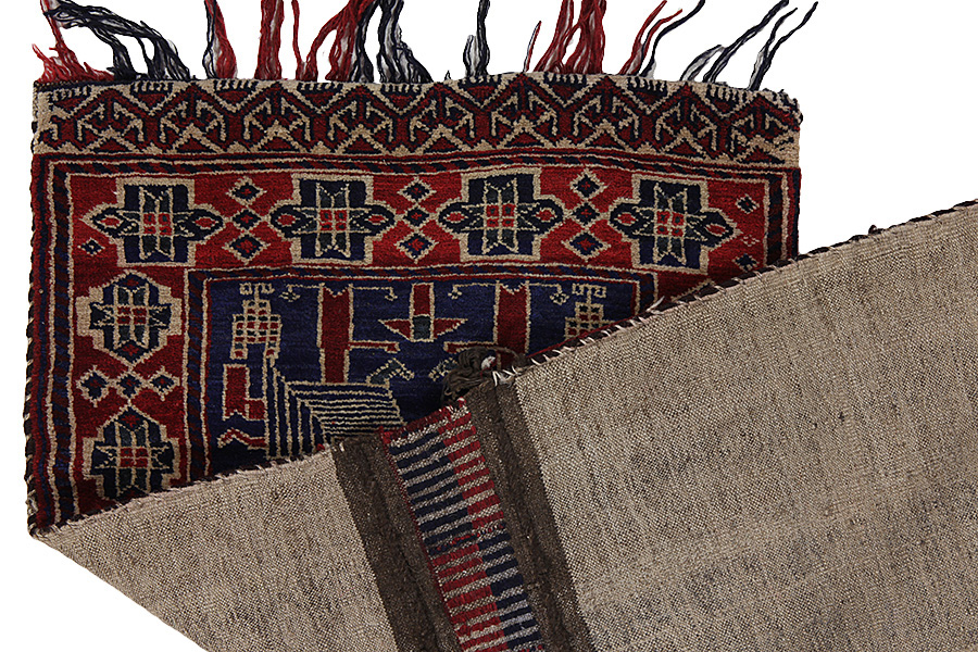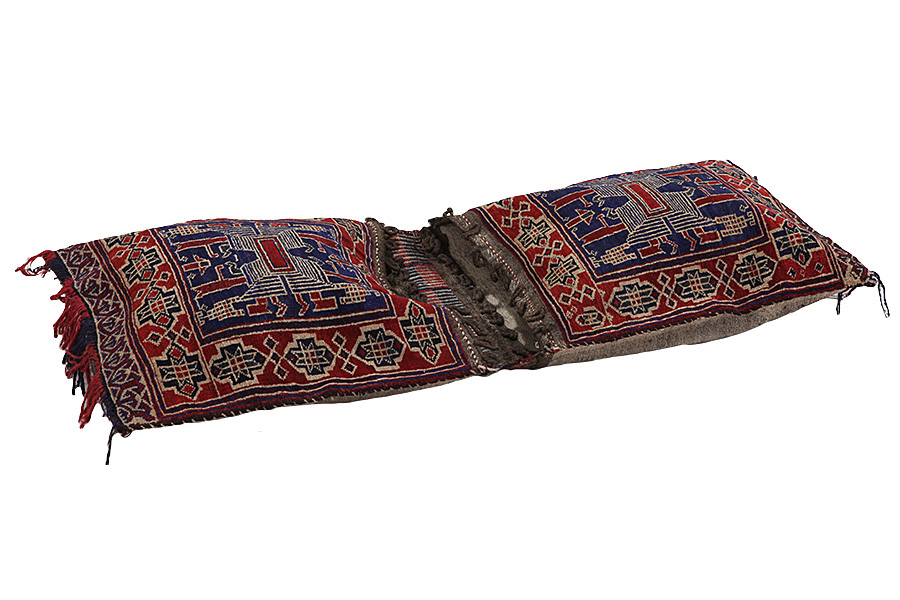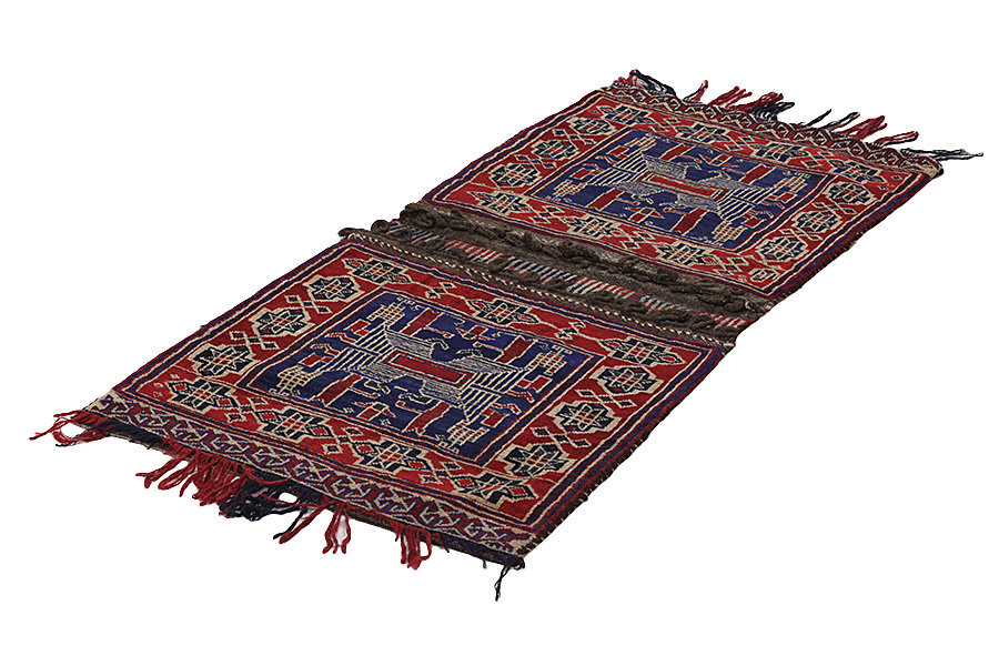 Tappeti Saddle Bag: Borse da sella cavallo sono fatte da nomadi per uso proprio. Si possono distinguere tra i kilim-cavallo borse da sella e le borse da sella cavallo. La parte anteriore di questo sacchetto e annodato come sella da cavallo o è annodato comeun tappeto comune con nodi ma capita anche che vengono utilizzate diverse tecniche di annodamento miste. Le parti laterali sono spesso tessuti mentre nella parte centrale sono applicate speso diverse tecniche di tessitura come i kelim o i Soumak. I colori delle Saltbags sono tutti naturali e creati da gli stessi i Nomadi. Borse come queste di solito vengono usate tutti i giorni per i viaggiatori su asini o cavalli. Un opera d'arte che offre un'atmosfera unica e orientale a casa vostra. Questi sacchetti possono essere utilizzati come cuscini, o per esempio sul pavimento come un cuscino davanti al camino,o come decorazione per il muro. Queste piccole borse da sella cavallo possono anche essere utilizzate come una "tasca" per giornali e altri oggetti quando e appeso suuna sedia o un divano.