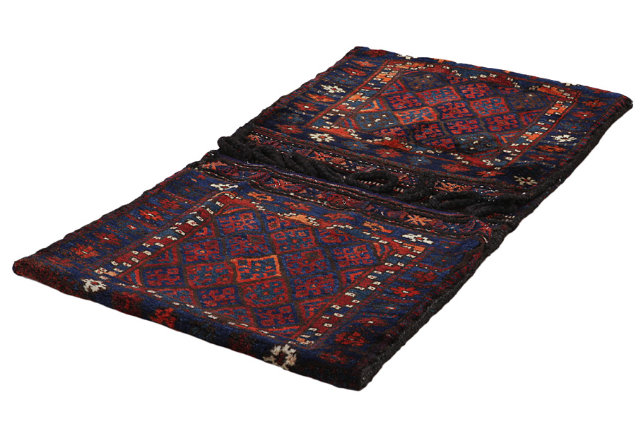 Tappeti Saddle Bag: Borse da sella cavallo sono fatte da nomadi per uso proprio. Si possono distinguere tra i kilim-cavallo borse da sella e le borse da sella cavallo. La parte anteriore di questo sacchetto e annodato come sella da cavallo o è annodato comeun tappeto comune con nodi ma capita anche che vengono utilizzate diverse tecniche di annodamento miste. Le parti laterali sono spesso tessuti mentre nella parte centrale sono applicate speso diverse tecniche di tessitura come i kelim o i Soumak. I colori delle Saltbags sono tutti naturali e creati da gli stessi i Nomadi. Borse come queste di solito vengono usate tutti i giorni per i viaggiatori su asini o cavalli. Un opera d'arte che offre un'atmosfera unica e orientale a casa vostra. Questi sacchetti possono essere utilizzati come cuscini, o per esempio sul pavimento come un cuscino davanti al camino,o come decorazione per il muro. Queste piccole borse da sella cavallo possono anche essere utilizzate come una "tasca" per giornali e altri oggetti quando e appeso suuna sedia o un divano.