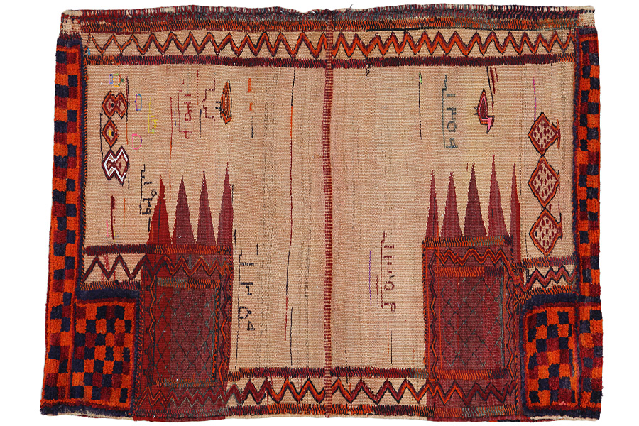 Tappeti Saddle Bag: Borse da sella cavallo sono fatte da nomadi per uso proprio. Si possono distinguere tra i kilim-cavallo borse da sella e le borse da sella cavallo. La parte anteriore di questo sacchetto e annodato come sella da cavallo o è annodato comeun tappeto comune con nodi ma capita anche che vengono utilizzate diverse tecniche di annodamento miste. Le parti laterali sono spesso tessuti mentre nella parte centrale sono applicate speso diverse tecniche di tessitura come i kelim o i Soumak. I colori delle Saltbags sono tutti naturali e creati da gli stessi i Nomadi. Borse come queste di solito vengono usate tutti i giorni per i viaggiatori su asini o cavalli. Un opera d'arte che offre un'atmosfera unica e orientale a casa vostra. Questi sacchetti possono essere utilizzati come cuscini, o per esempio sul pavimento come un cuscino davanti al camino,o come decorazione per il muro. Queste piccole borse da sella cavallo possono anche essere utilizzate come una "tasca" per giornali e altri oggetti quando e appeso suuna sedia o un divano.