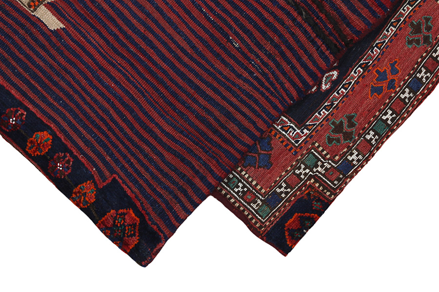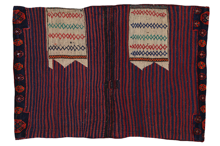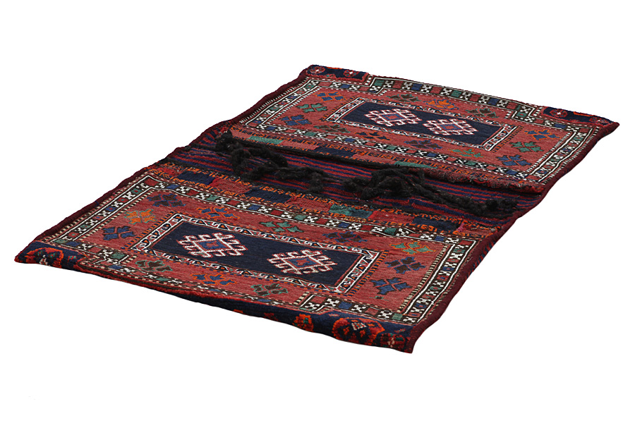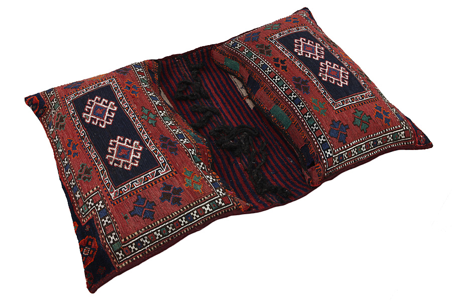 Tappeti Saddle Bag: Borse da sella cavallo sono fatte da nomadi per uso proprio. Si possono distinguere tra i kilim-cavallo borse da sella e le borse da sella cavallo. La parte anteriore di questo sacchetto e annodato come sella da cavallo o è annodato comeun tappeto comune con nodi ma capita anche che vengono utilizzate diverse tecniche di annodamento miste. Le parti laterali sono spesso tessuti mentre nella parte centrale sono applicate speso diverse tecniche di tessitura come i kelim o i Soumak. I colori delle Saltbags sono tutti naturali e creati da gli stessi i Nomadi. Borse come queste di solito vengono usate tutti i giorni per i viaggiatori su asini o cavalli. Un opera d'arte che offre un'atmosfera unica e orientale a casa vostra. Questi sacchetti possono essere utilizzati come cuscini, o per esempio sul pavimento come un cuscino davanti al camino,o come decorazione per il muro. Queste piccole borse da sella cavallo possono anche essere utilizzate come una "tasca" per giornali e altri oggetti quando e appeso suuna sedia o un divano.