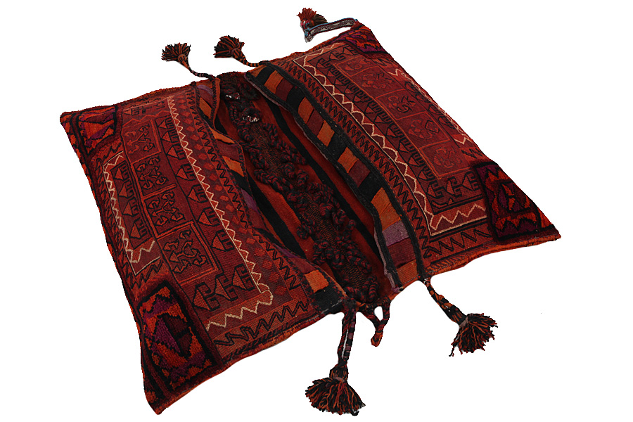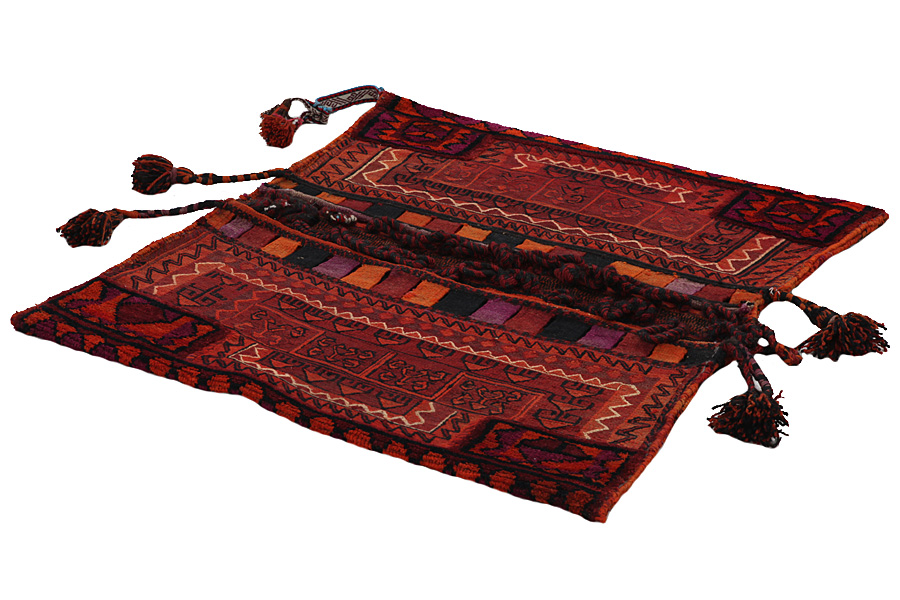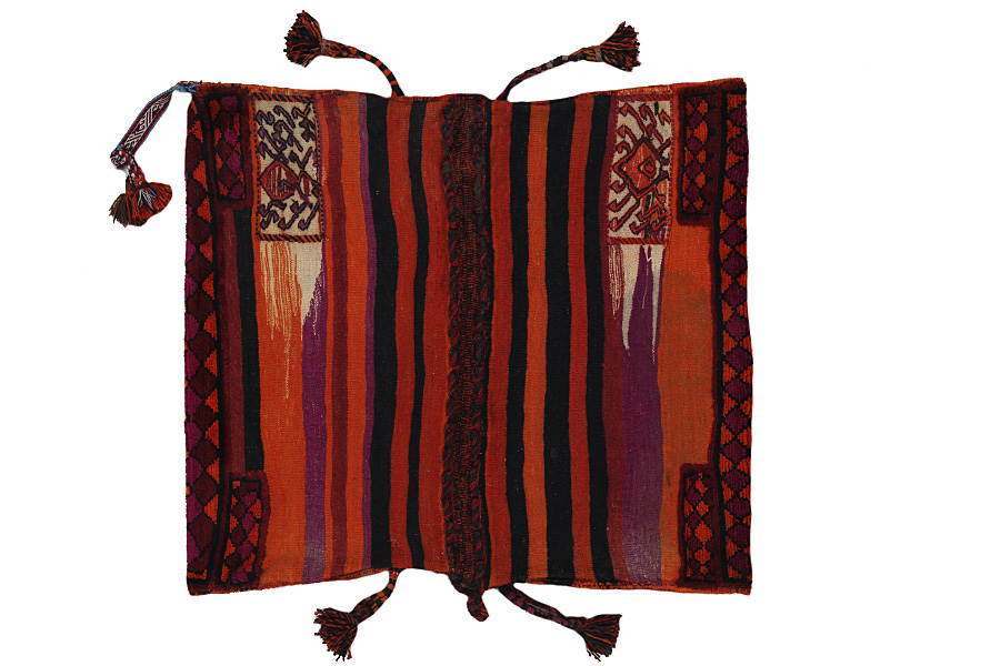 Tappeti Saddle Bag: Borse da sella cavallo sono fatte da nomadi per uso proprio. Si possono distinguere tra i kilim-cavallo borse da sella e le borse da sella cavallo. La parte anteriore di questo sacchetto e annodato come sella da cavallo o è annodato comeun tappeto comune con nodi ma capita anche che vengono utilizzate diverse tecniche di annodamento miste. Le parti laterali sono spesso tessuti mentre nella parte centrale sono applicate speso diverse tecniche di tessitura come i kelim o i Soumak. I colori delle Saltbags sono tutti naturali e creati da gli stessi i Nomadi. Borse come queste di solito vengono usate tutti i giorni per i viaggiatori su asini o cavalli. Un opera d'arte che offre un'atmosfera unica e orientale a casa vostra. Questi sacchetti possono essere utilizzati come cuscini, o per esempio sul pavimento come un cuscino davanti al camino,o come decorazione per il muro. Queste piccole borse da sella cavallo possono anche essere utilizzate come una "tasca" per giornali e altri oggetti quando e appeso suuna sedia o un divano.