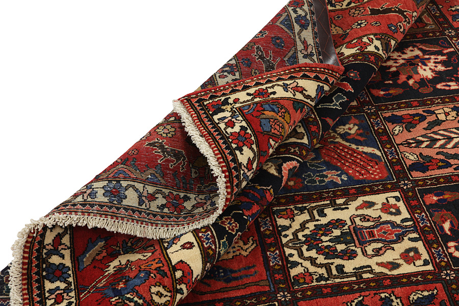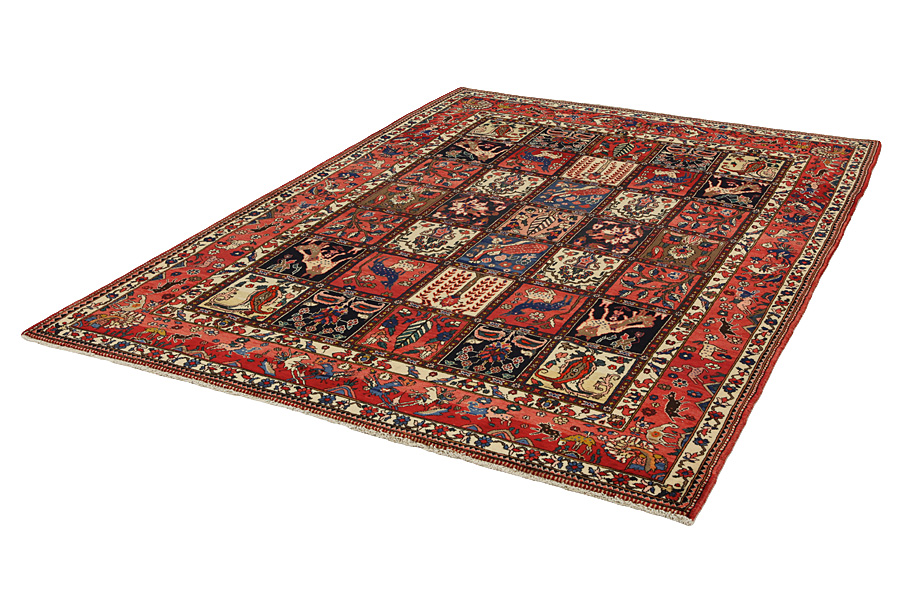 Tappeti Bakhtiari: Sui monti Zagros,a occidente della città Isfahan,intorno alla città Shar-e-Kurd, vivono i nomadi Bakhtiar.I loro tappeti sono noti per il disegno con vari quadrati ripetuti, in cui vengono rappresentati fiori o animali.Per questa ragione il disegno si chiama " Giardino"(Khesti).I loro tappeti sono assai robusti,dalla tessitura fitta e sono di una lana di qualità molto buona,ricavata da pecore che pascolano ad alta quota.I migliori tappeti Bakhtiari che hanno la maggiore fittezza di nodi si chiamano Bibibaf.In oltre in molti disegni si notano influenze dei manufatti Isfahan(Boldaji,Feridan,Saman).